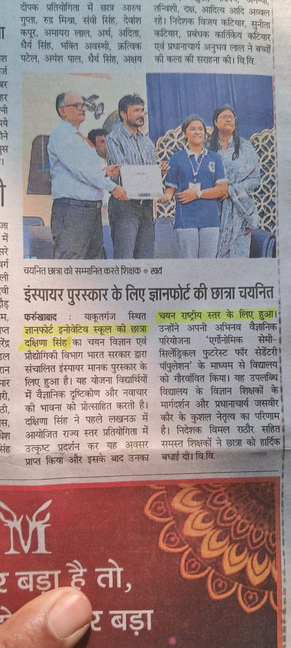 We are thrilled to announce that Dakshina Singh (Grade 8) from Gyanfort Innovative School has been selected for the prestigious INSPIRE MANAK event at the national level! ππ